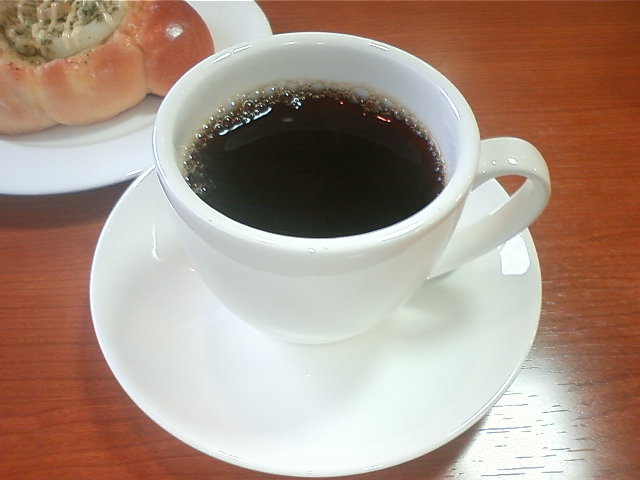 カフェスペースでいただいたコーヒーと「バジルチキンチーズ和え」