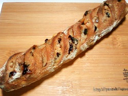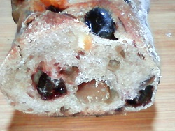 ライ麦パンです。 ハードなクラストの中は、シナモン、カルダモン、ラム酒で3日間漬け込んだドライフルーツ(レーズン、プルーン、イチジク、ドレンチェリー、オレンジスライス)とナッツ(クルミ、マカダミア、アーモンド)がたっぷり入っています。